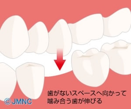 抜けた歯の両隣は、空いたスペースに向かって倒れ込むように動きます。さらに、抜けた歯とかみ合っていた反対側の歯は、相手を求めて伸び出してきます(挺出)。この「ドミノ倒し」のような動きで、上下の歯の高さや位置関係が乱れ、顎関節への負担や、噛みしめ・歯ぎしりの悪化につながります。