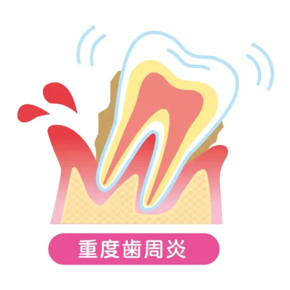歯周ポケットの深さは7mm以上になり、歯槽骨が半分以上破壊され、歯はぐらぐらになります。歯根の半分以上の骨が吸収してしまった状態は重度です。痛みはないことがほとんどですが、歯がぐらついたり、歯茎から膿が出るような状態です。歯茎もだいぶ下がってきているかもしれません。